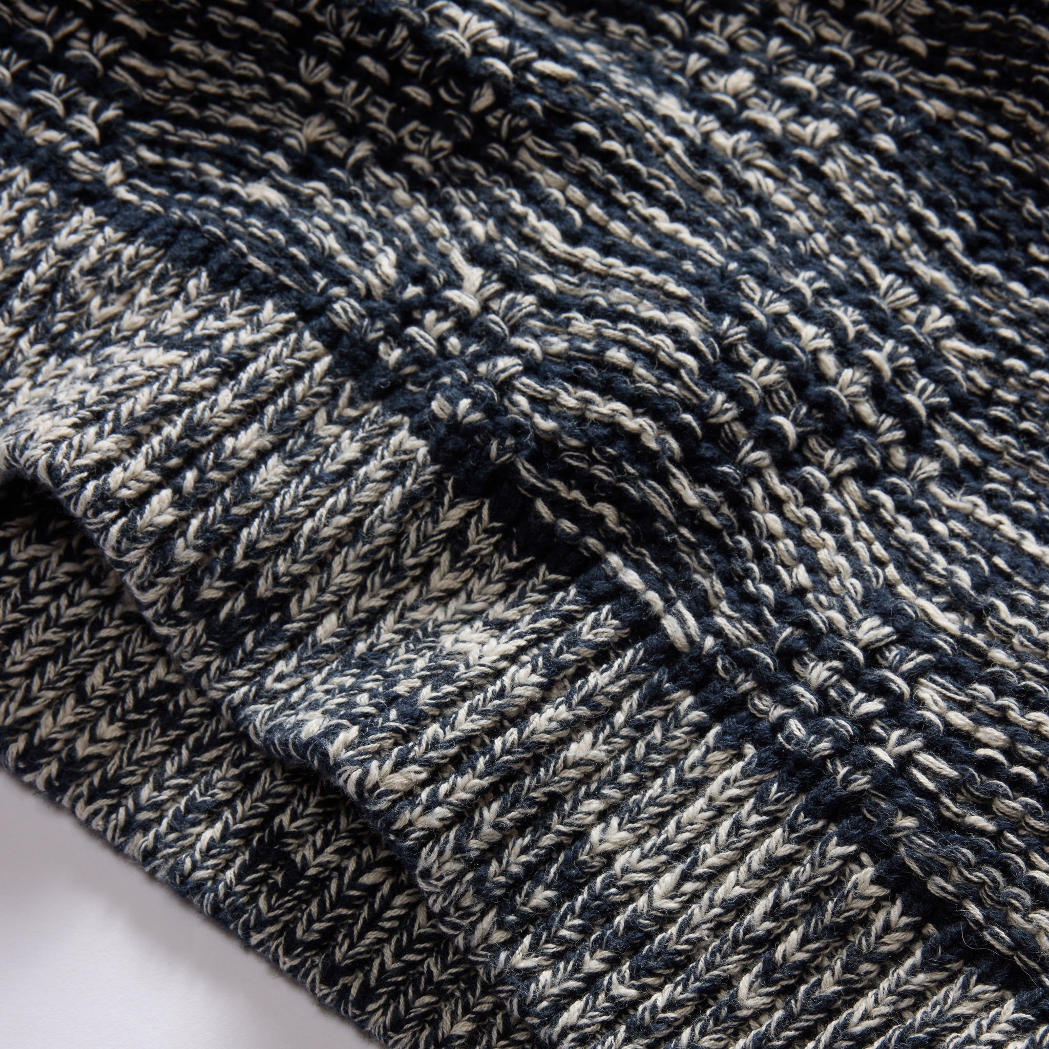 - 1x1 melange rib construction on collar, sleeve cuffs and hem with solid navy border.