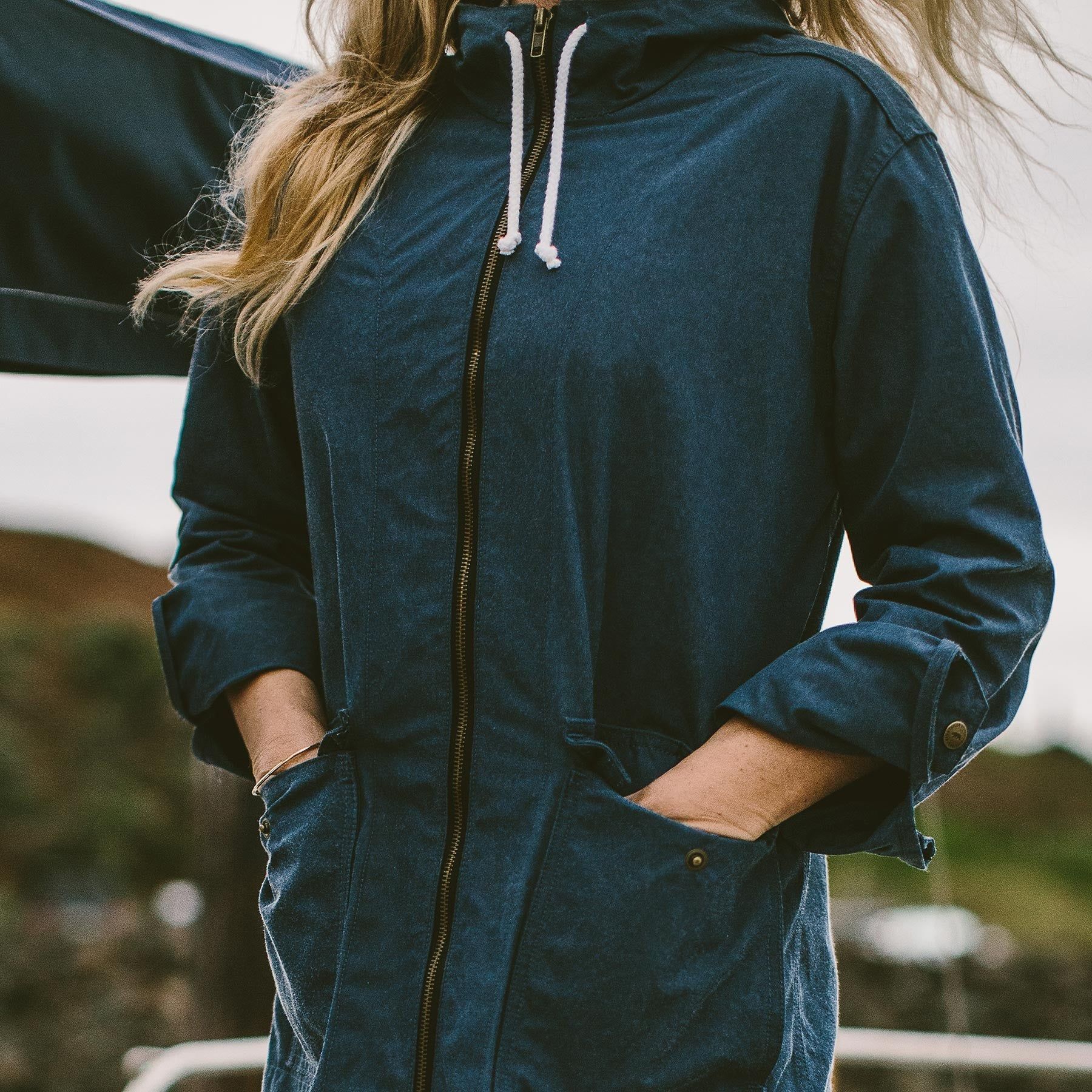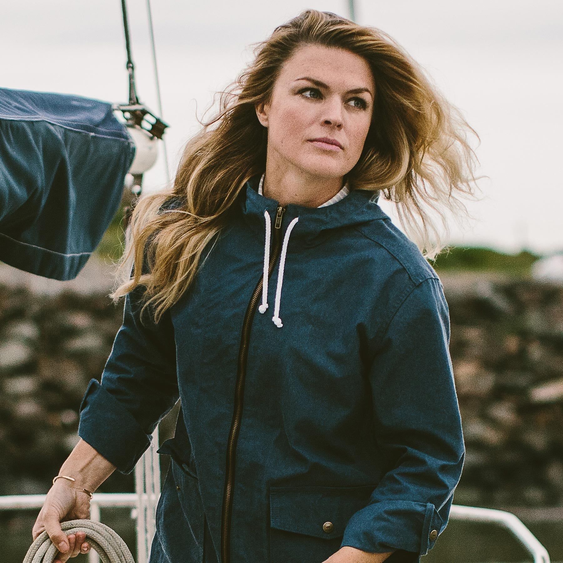 Men and women alike have come to favor the Beach Jacket from our men's collection, so we perfected its fit for ladies. Halley Stevensons have been waxed cotton specialists for years, and make some of the best stuff on the planet. You'll stay dry on the boat (and on land) and look on point.