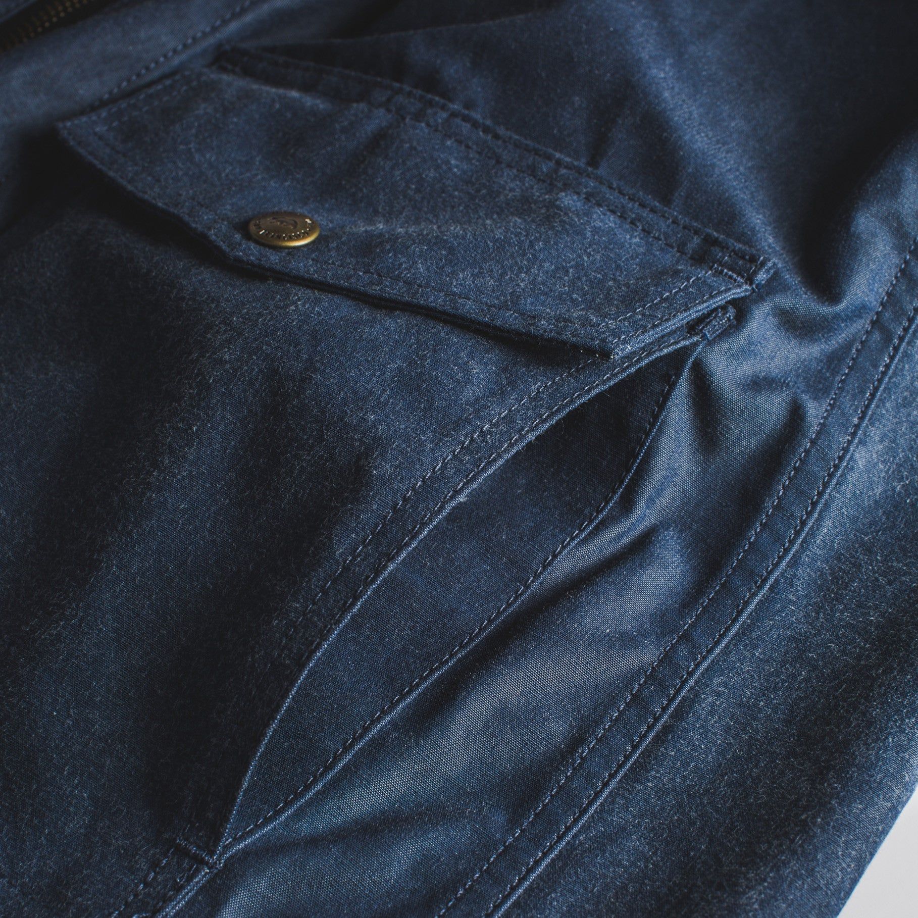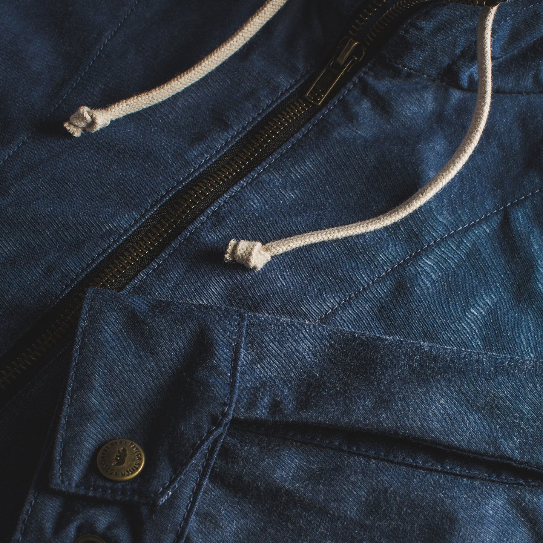 - Custom antique brass YKK snaps.
