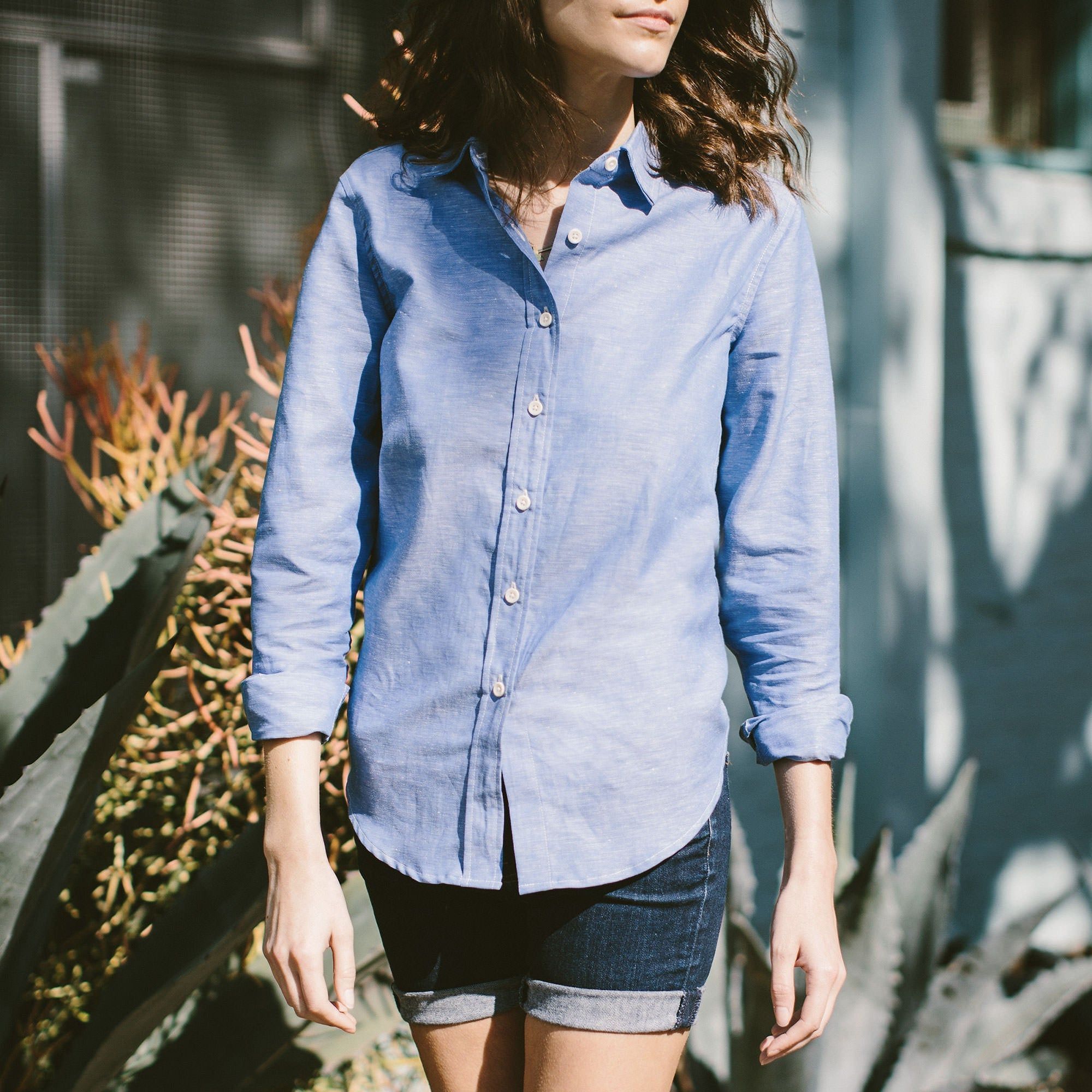 Our favorite button-down, made in the bluest shade of the summer sky. A slim arm and long hem make this top super-flattering. Wear it true to size for a tailored look or size up for a relaxed fit.